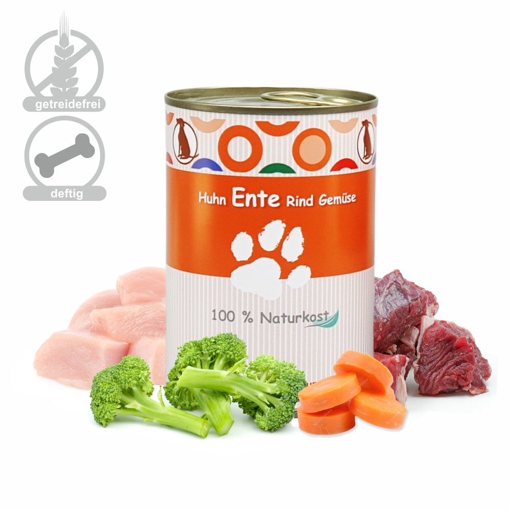 Hochwertiges Fleischmenue bestehend aus Huhn und Rind, Ente ergänzt nach BARF-Philosophie mit Karotten und Brokkoli
